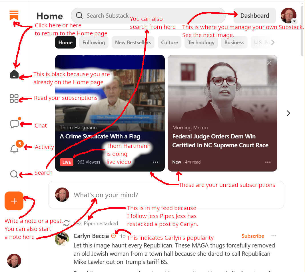 The Substack interface is not very intuitive. When the orange Substack chevron is showing at the top left, you’re reading Substack. The icons at the left are Home, Subscriptions, Chat, Activity, Search, then Orange-Plus to write something. Here is the home page with annotations. Click on the image to expand it.