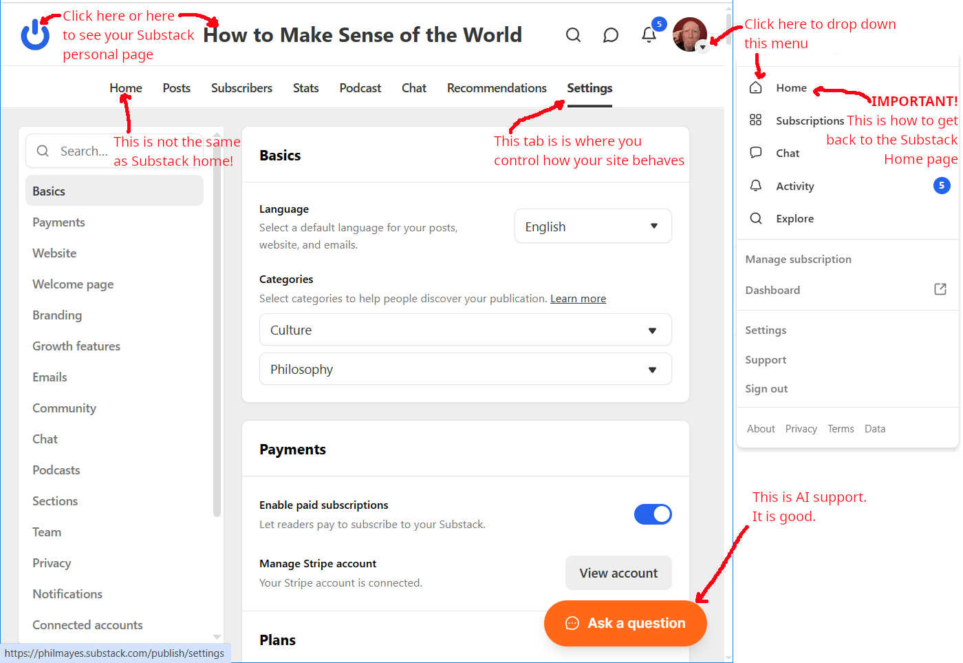 To work on your account, click the gray “Dashboard” button near the top right. The icon at the top left changes to your personal icon (or the one Substack has chosen for you). The dashboard has a bunch of tabs: Home, Posts, Subscribers, Stats, Podcast, Chat, Recommendations, and Settings. Go to Settings to control how your site behaves: